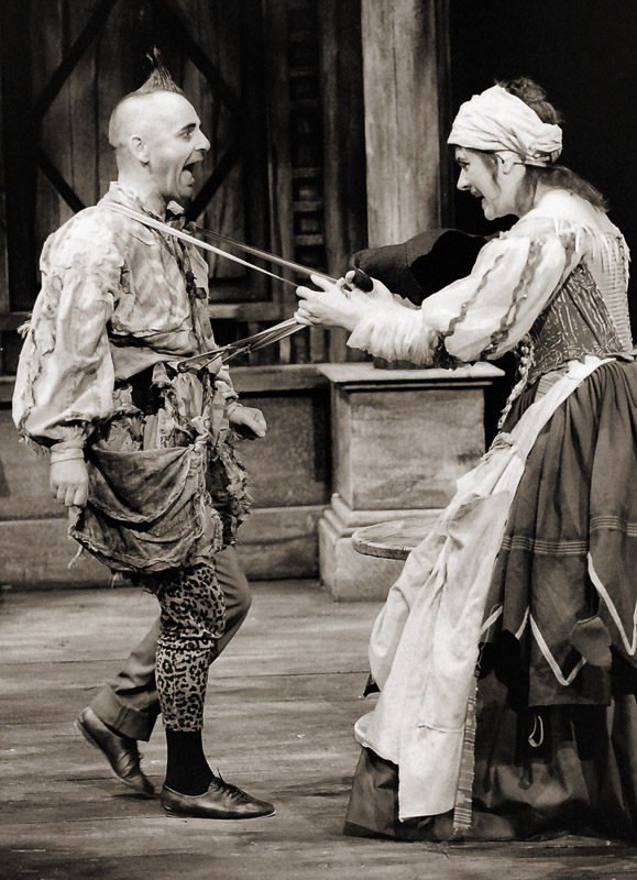 201 / 421 Twelfth Night by William Shakespeare Sylvester McCoy (as Feste) and Cindy Oswin (as Maria), director Nancy Meckler, Leicester Haymarket Theatre, 1986