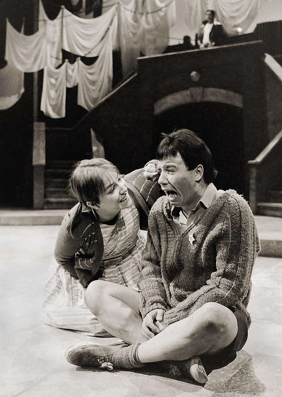 157 / 421 Blood Brothers by Willy Russell Susie McKenna (as Linda), David Edge (as Mickey) and Warwick Evans (as the Narrator), director Warren Hooper, Leicester Haymarket Theatre, 1986