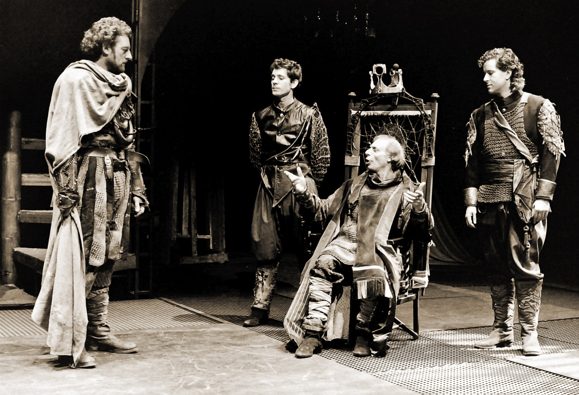 128 / 421 Macbeth by William Shakespeare Bernard Hill (as Macbeth), Simon Williamson (as Donalbain), Martin Friend (as Duncan) and Jeremy Swift (as Malcolm), directors Nancy Meckler & The People Show, Leicester Haymarket Theatre, 1985