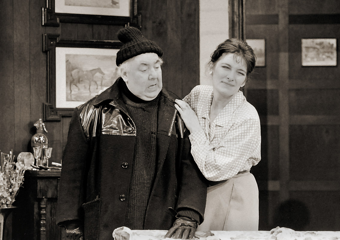 274 / 421 Noises Off by Michael Frayn Ken Parry (as Selsdon Mowbray) and Rachel Davies (as Belinda Blair), director Ultz, Leicester Haymarket Theatre, 1988